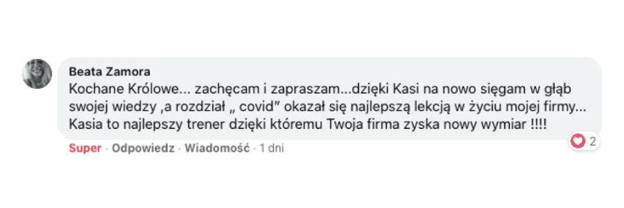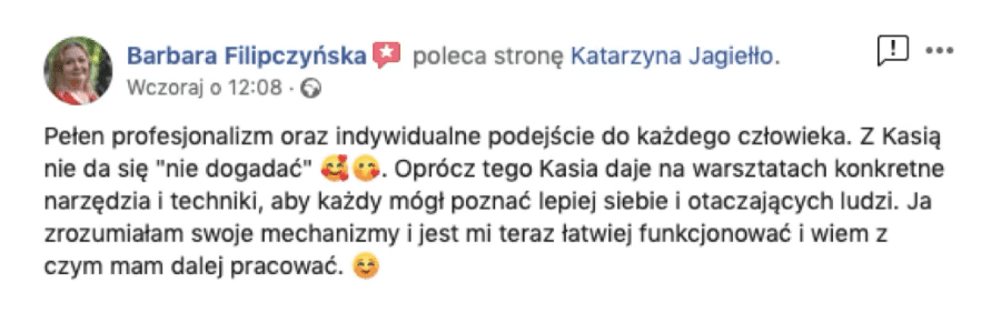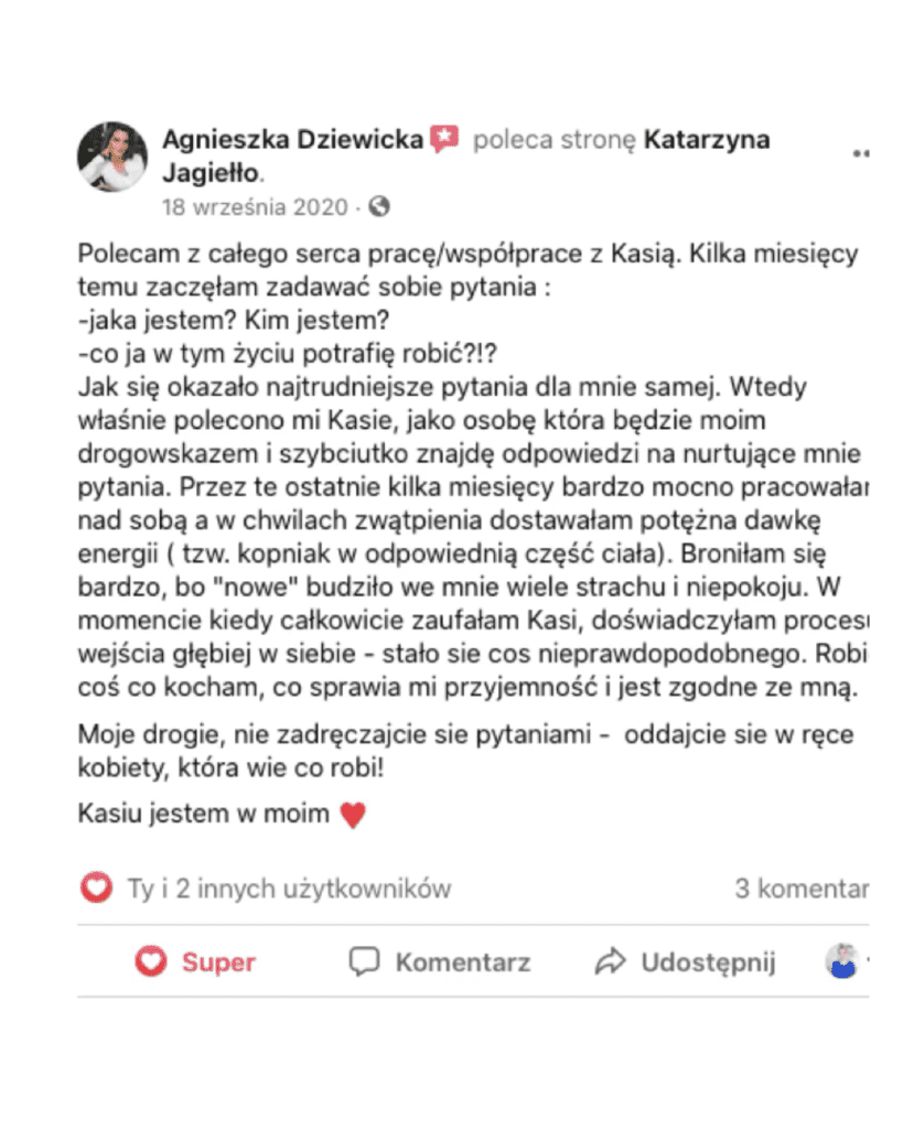 Miałam przyjemność uczestniczyć w mentoringu. (...) Nasze rozmowy aktywowały we mnie tyle mocy oraz świadomości dotyczącej własnego potencjału, tego co posiadam i doświadczeń jakimi dysponuję, że w ciągu kilku tygodni dokonałam rebrandingu mojej marki, podniosłam stawki i zorganizowałam swoje pierwsze warsztaty! Co więcej, Kasia była tam gościem specjalnym i zachwyciła moje wspaniałe uczestniczki. Nasz wspólny proces rozpoczął zmiany, które trwają do dzisiaj, a ja nie jestem już tą samą osobą co rok temu! Drogie Królowe, jeśli szukacie mentorki, która odkryje Wasz potencjał, uświadomi Wam moc jaka w Was tkwi, da Wam dużo uwagi i przy tym będzie pełna niezwykle pozytywnej energii (ktorą osobiście uwielbiam ) to gorąco polecam Wam współpracę z Katarzyną Jagiełło - zarówno tą mentoringową, jak i tą w ramach jej programów.