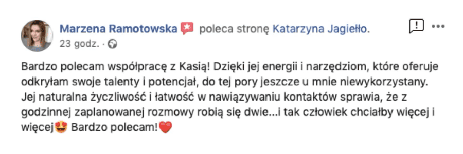 Kasiu, praca z Tobą to zdecydowany ruch do przodu, dziękuję za pomoc w głębokiej analizie talentów i przełożenia do na moje działania i organizację biznesu. Każda sesja z Tobą to Game changer, a cały proces bardzo transformujący i rozwijający. Bardzo sobie cenię Twoją otwartość, stały kontakt, wsparcie w procesie zmian i dzielenie się wiedzą więcej niż bym się spodziewała. W stosunkowo krótkim czasie zrobiłam progres i strategię której się nie spodziewałam. Każdy wspaniała kobieta powinna mieć takie wsparcie mentorki 💖